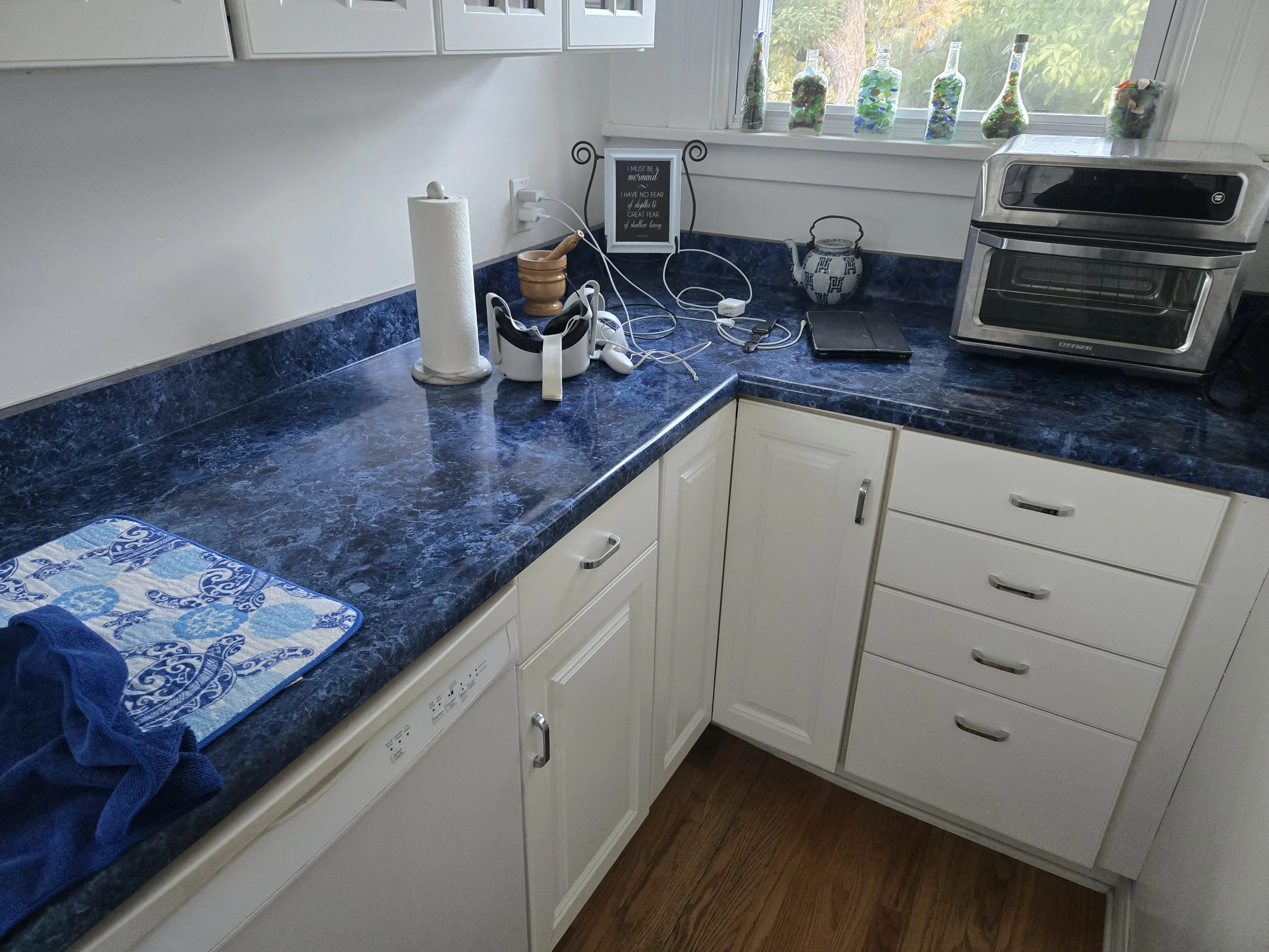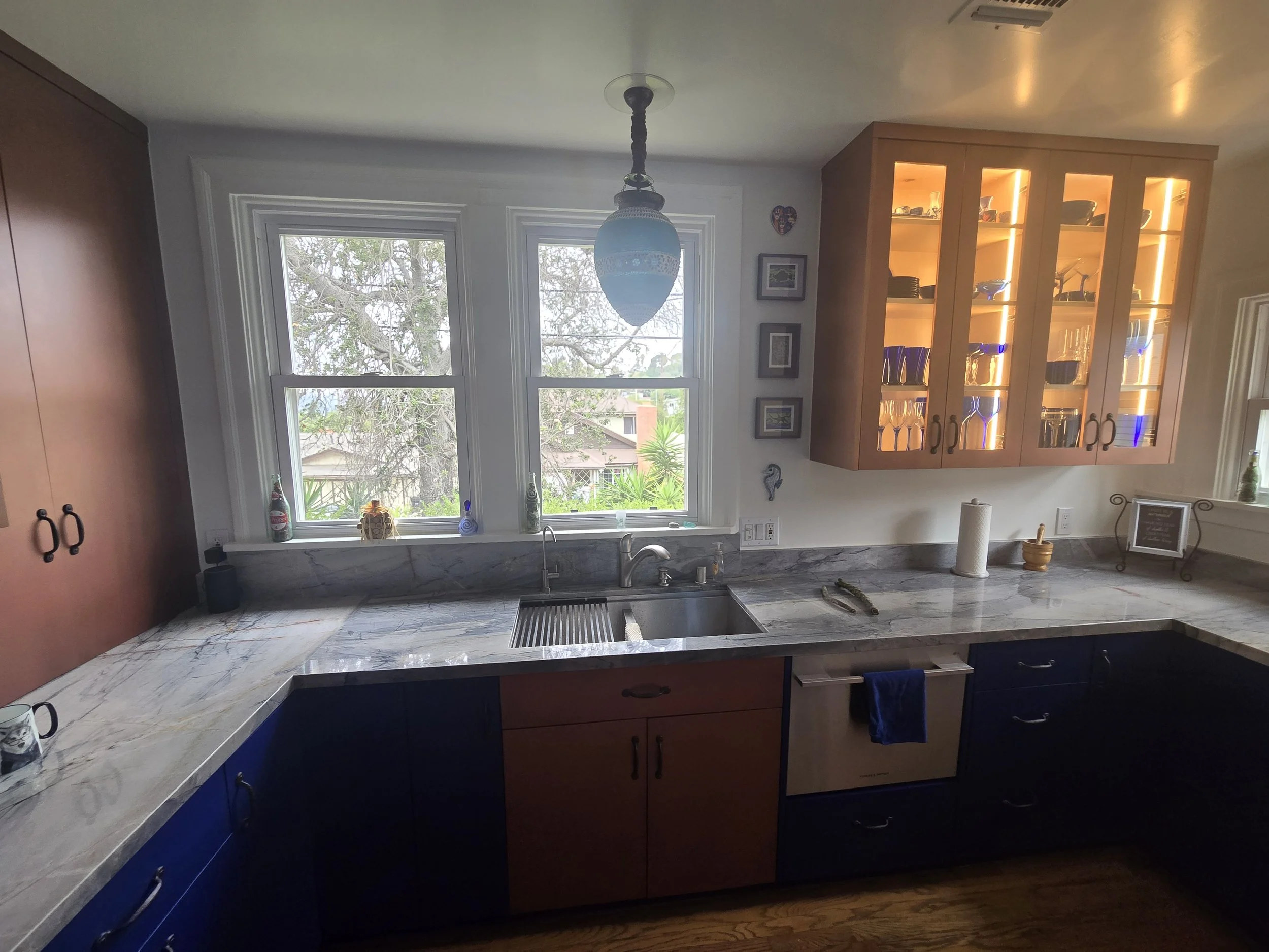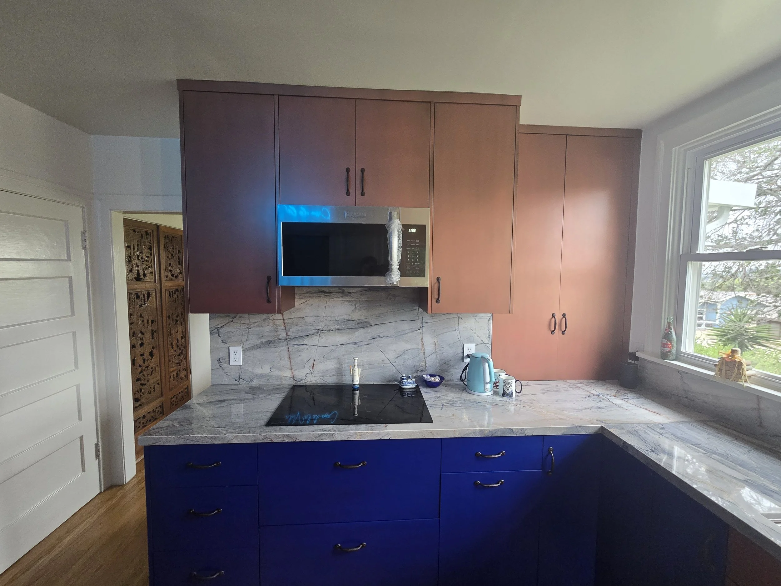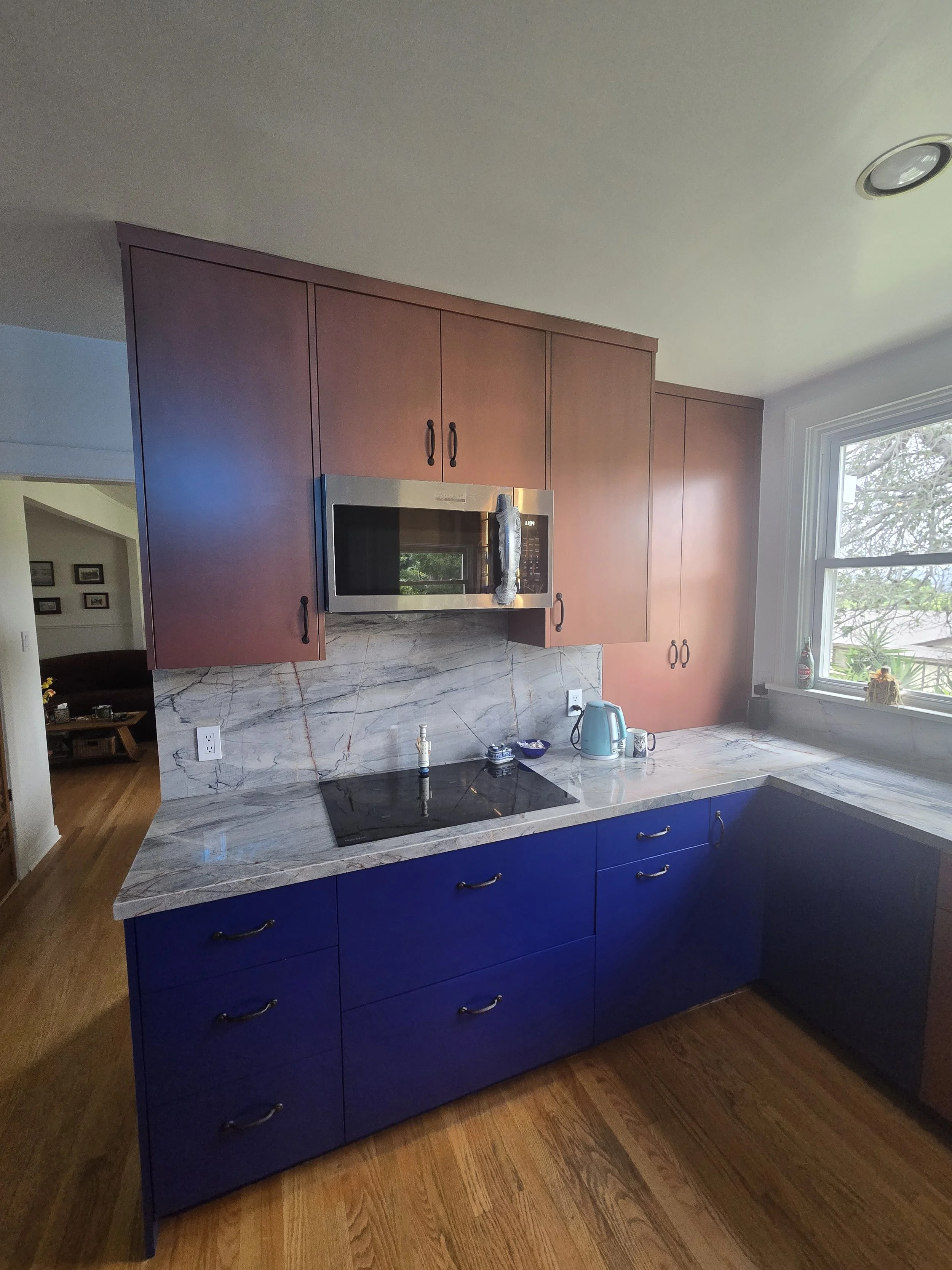 This remodeled kitchen features a bold and modern design that balances warm and cool tones with premium finishes. The upper cabinets are crafted in a copper-rust finish, providing a rich, earthy warmth, while the lower cabinets showcase a striking blue metallic finish that adds depth and contrast. A glass-front display cabinet with integrated LED lighting highlights glassware and creates a sophisticated focal point above the sink area.