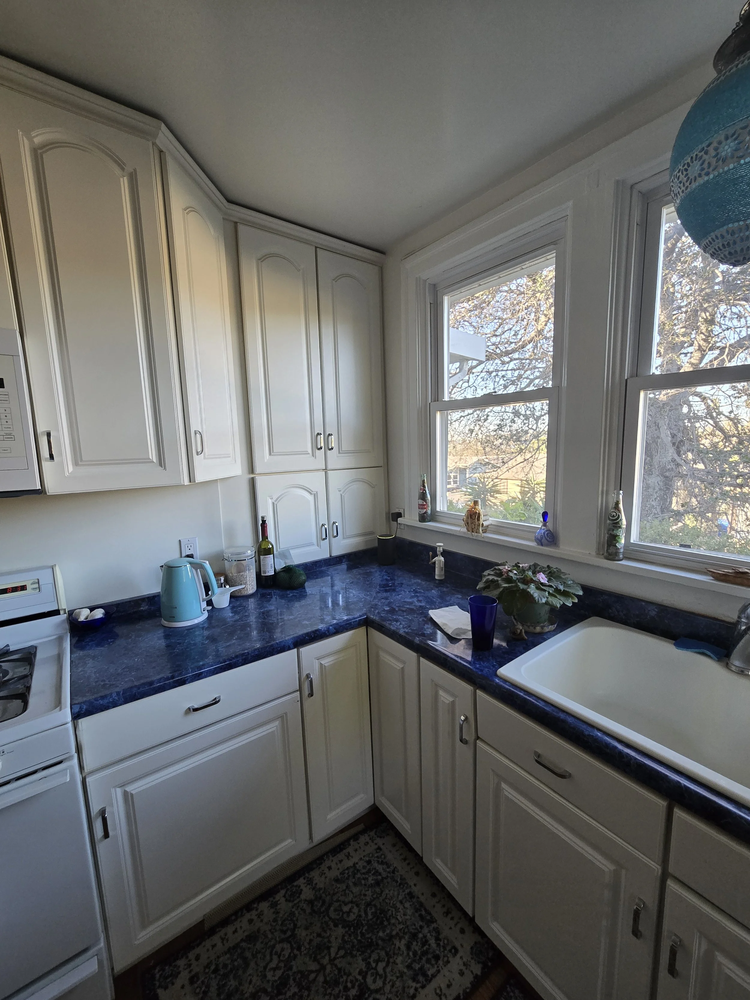 The countertops and full backsplash are fabricated from elegant quartz, with dramatic veining that enhances the luxury feel of the space while providing durability and low maintenance. A stainless steel undermount sink is paired with a sleek modern faucet, positioned perfectly under a wide set of windows that flood the kitchen with natural light.