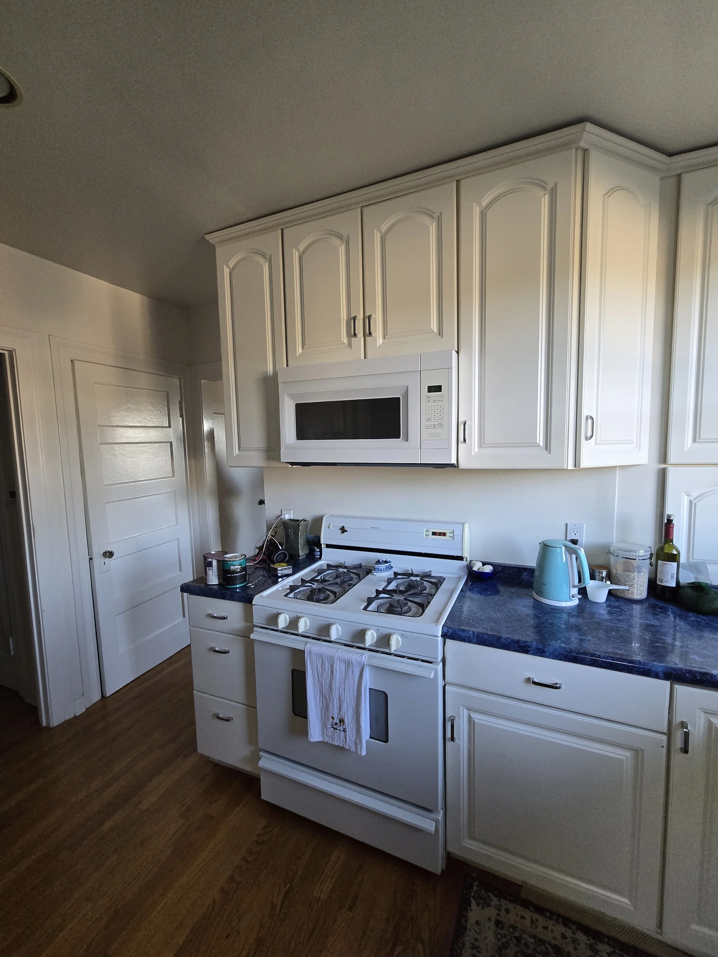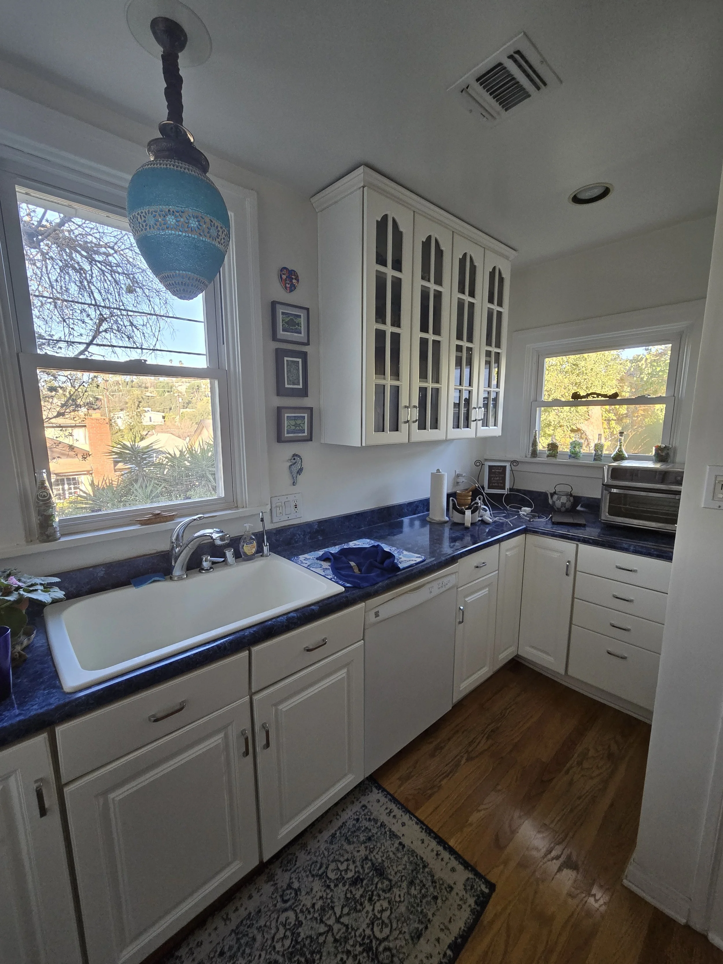 For performance and efficiency, the kitchen is equipped with a 220V line powering an energy-efficient induction cooktop, paired with an energy-efficient stainless steel micro-hood for ventilation. A super water-efficient dishwasher is seamlessly integrated into the lower cabinetry, ensuring sustainability without compromising convenience.