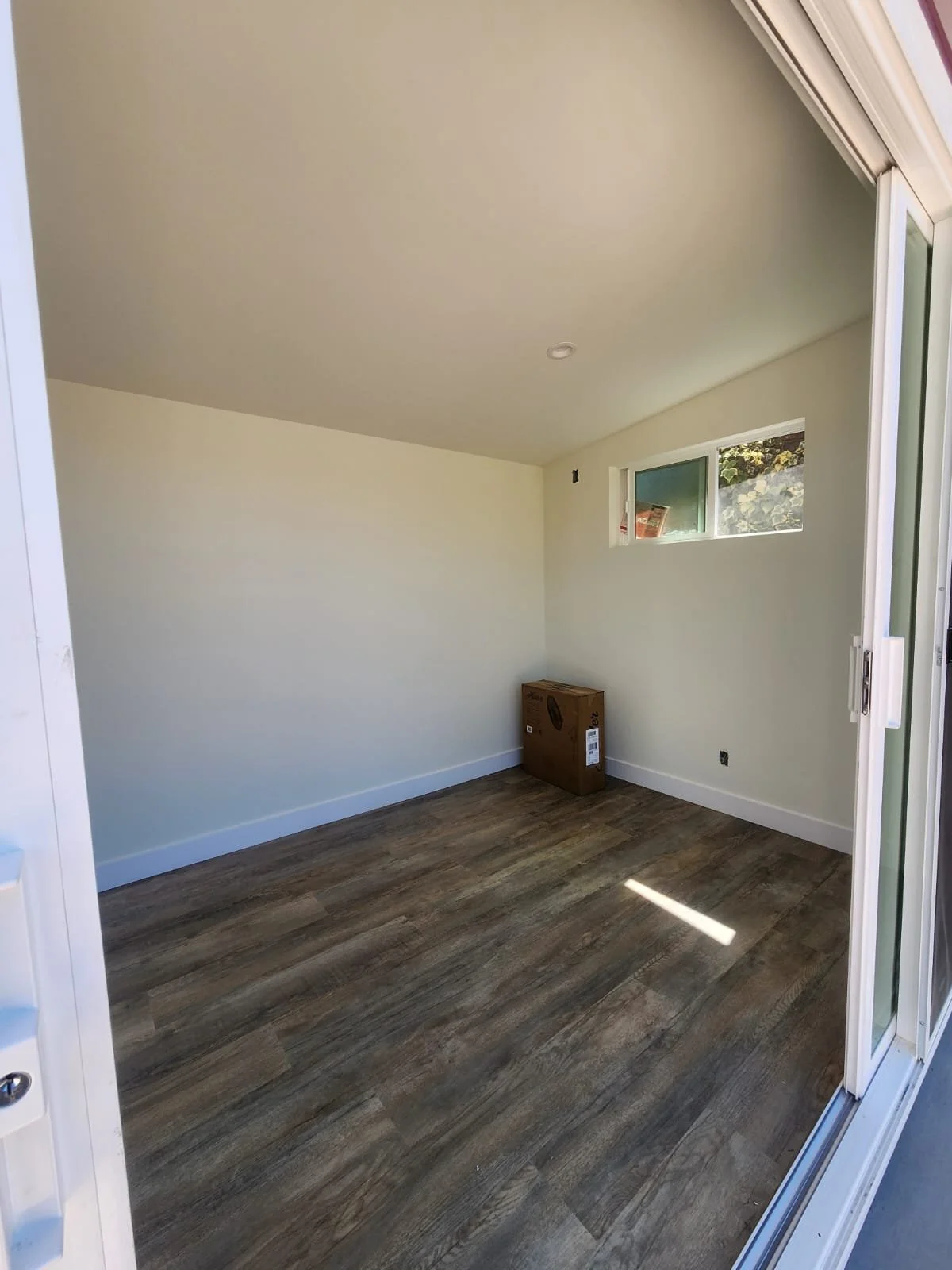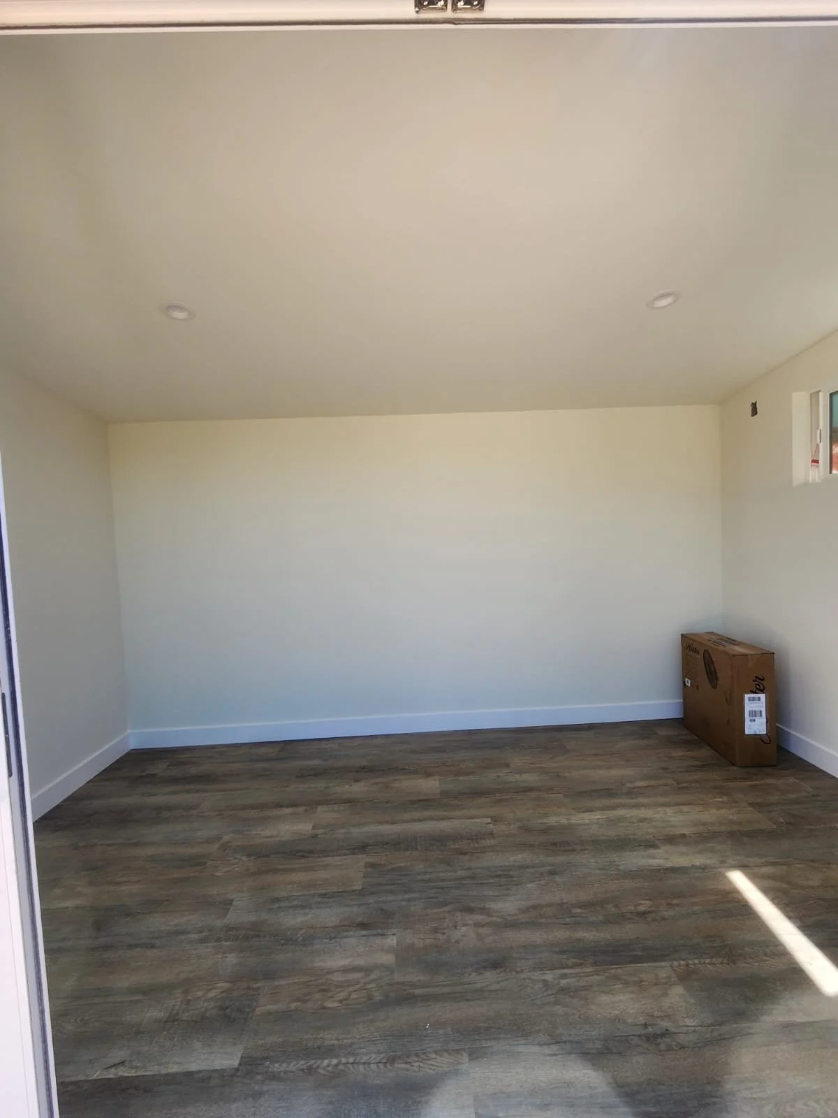Inside, the shed is outfitted with recessed LED lighting and multiple electrical outlets for convenience. The flooring is finished with vinyl planks in a wood-look design, complemented by crisp white baseboards for a polished appearance.